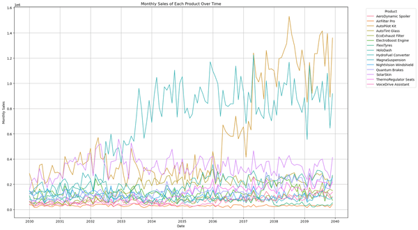 Monthly Sales of Each Product Over Time.